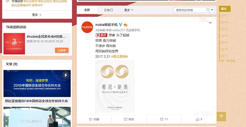 努比亚春季新品发布会召开在即,官微的一纸海报证实了之前的猜测:努比亚已经准备好了一款搭载后置双摄像头的新品。众所周知,刚刚过去的一年对努比亚来说堪称“春风得意”:Z11系列的上市、与皇马天王C罗的合作以及努比亚品牌成立四周年庆典都给消费者留下了极为深刻的印象;另一方面,手机市场上的双摄方案虽然多见但体验不足,向来以手机摄影见长的努比亚手机打算在双摄领域大展拳脚也在情理之中。