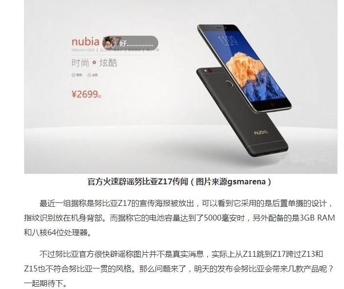 经过多方求证以及各路媒体的集中调查,现在终于水落石出:“努比亚Z17”确实出现过在官方首页上,但那只是一个测试页面而已,可能是刚刚测试上线就被日夜关注的玩家截图留下,然后发到网上“弄了个大新闻”,搞得网络上一时间风声四起。当然,明天将要发布新机的事情却是板上钉钉,不是“努比亚Z17”,而是“努比亚双摄新机”!