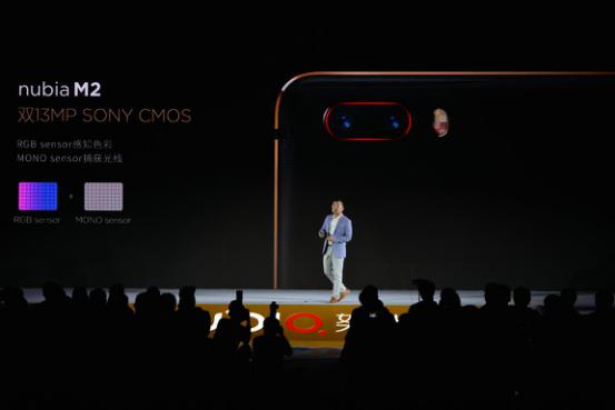就跟之前预热的一样,努比亚M2系列最大的亮点就是采用了双摄系统,发布会上第一个亮点就是“黑白双摄”,一个RGB sensor与一个MONO senser组成了高画质的系统,MONO senser的进光量提升高达96.6%,协助RGB sensor带来更优秀的画质,也是努比亚“手机摄影专家”称号的最佳体现。