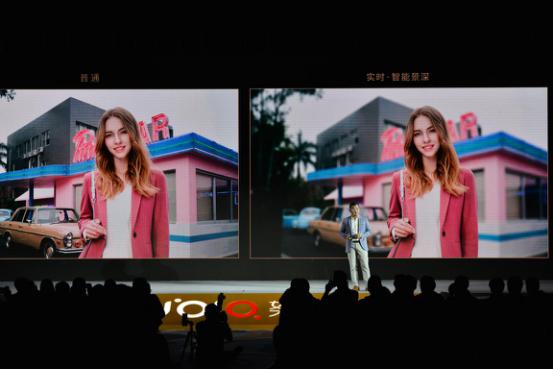 “人像模式”拥有实时智能景深调节,定制的景深芯片根据背景的不同自动调节景深,带来更加唯美美颜的效果。