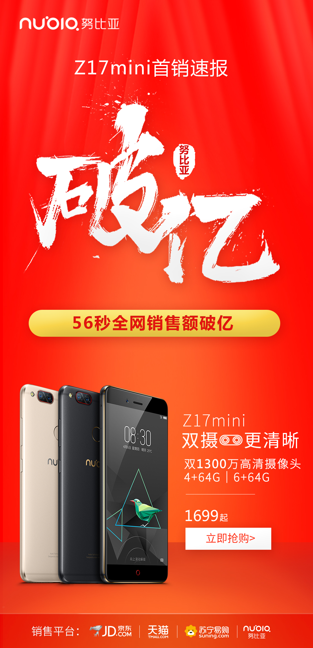 【CN314智能生活】努比亚Z17mini这款全新的“双摄小牛”自打一发布就成为玩家眼中关注的焦点,多少人就等着开售时刻来临。今天上午10点整,该机终于迎来首销,仅仅用了56秒时间,全网销售额就突破一个亿!买到的玩家们终于长出了一口气:“关注了这么时间,终于买到手了!”“终于能亲身体验这手机的亮点了,双摄、NeoVision影像引擎、大内存、高颜值,简直无法拒绝!”