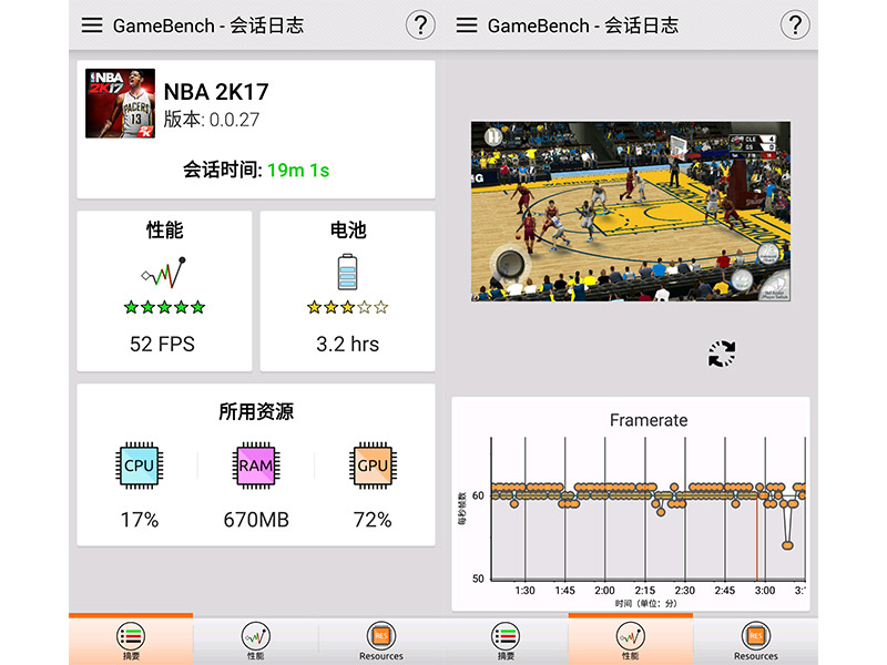 大型游戏方面,努比亚Z17mini能够完美运行《王者荣耀》和《NBA2K 17》两款游戏,其中前者轻松达到30FPS满帧;而后者在大部分时间内实现了60FPS满帧,整体帧率高达52,同样是极为流畅。