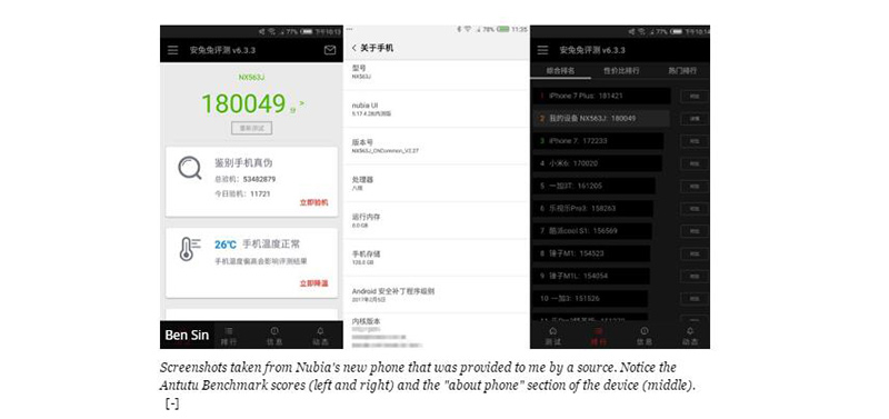 近日即将发布的努比亚新旗舰Z17遭遇多位业内人士大爆猛料:首先硬件配置方面,18万的安兔兔跑分令人震惊,除了高通骁龙835,8GB超级大内存的传言也有可能成真!
