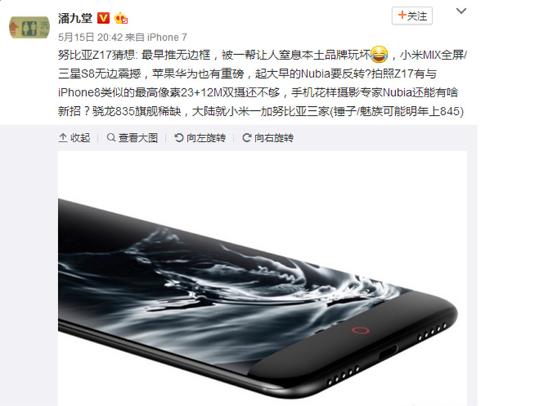 随后某业内大咖更是爆料Z17将会搭载2300万+1200万像素的双摄镜头,并指出其传感器与即将在今年秋季发布的iPhone8相似,这也意味着努比亚Z17走在了苹果前面!