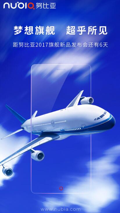 【CN314智能生活】距离6月1日努比亚新旗舰Z17发布会还有6天时间,有网友在努比亚官微中发现了努比亚的官方倒计时海报。海报中,一架喷气式客机在烂田中翱翔,朵朵白云从四周掠过,给人一种很强的视觉冲击力。很多网友都好奇,努比亚本来是要发布一款手机,为什么要拿飞行器当做海报的主体?