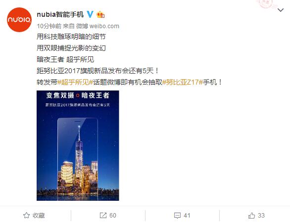 【CN314智能生活】距离努比亚新旗舰Z17的发布还有五天时间,今天努比亚官微中再次放出了一张倒计时海报,引起了人们的注意。海报中,“变焦双摄、暗夜王者”的文字非常醒目,而努比亚手机轮廓当中的高楼大厦看起来并不是常规的视角,更像是经过变焦之后放大的影像,因此就符合了“无损变焦”的这个猜测;而“暗夜王者”更是让人不禁猜想,难道夜景拍摄能力将会有极大的提高?