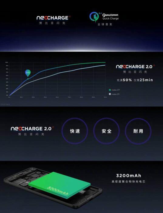 努比亚联合高通首发的QC4+快充技术则是最大亮点之一!QC4+快充技术不仅包括QC4技术的全部优势,还拥有双路充电、智能热平衡、更先进的安全功能三个增强特性,并有潜力实现将充电速度提升15%,或提高充电效率30%。在此基础之上,努比亚研发的NeoCharge2.0闪充就采用了双路并行智能安全充电模式,降低充电发热、提升充电效率,让玩家们体验到“一杯咖啡满血复活”的充电效率,即便是手机电量快到用完了,一样能让玩家以最短的时间重新获得饱满的电量。