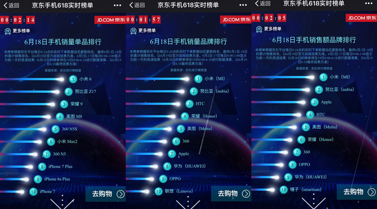 而在618零点的再次开售中,Z17更是获得了京东手机销量品牌排行、手机销售额品牌排行与手机销量单品排行三大榜单的第二名。