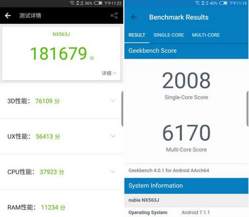 从跑分软件截图中可以看到,一加5的跑分成绩已经快要达到18万分,这在2017年中期算是不错的水平,而努比亚Z17已经超过18万分。那么,两者同样都搭载了骁龙835处理器,也都拥有8GB大内存,为什么努比亚Z17要比一加5的跑分还要高出不少呢?