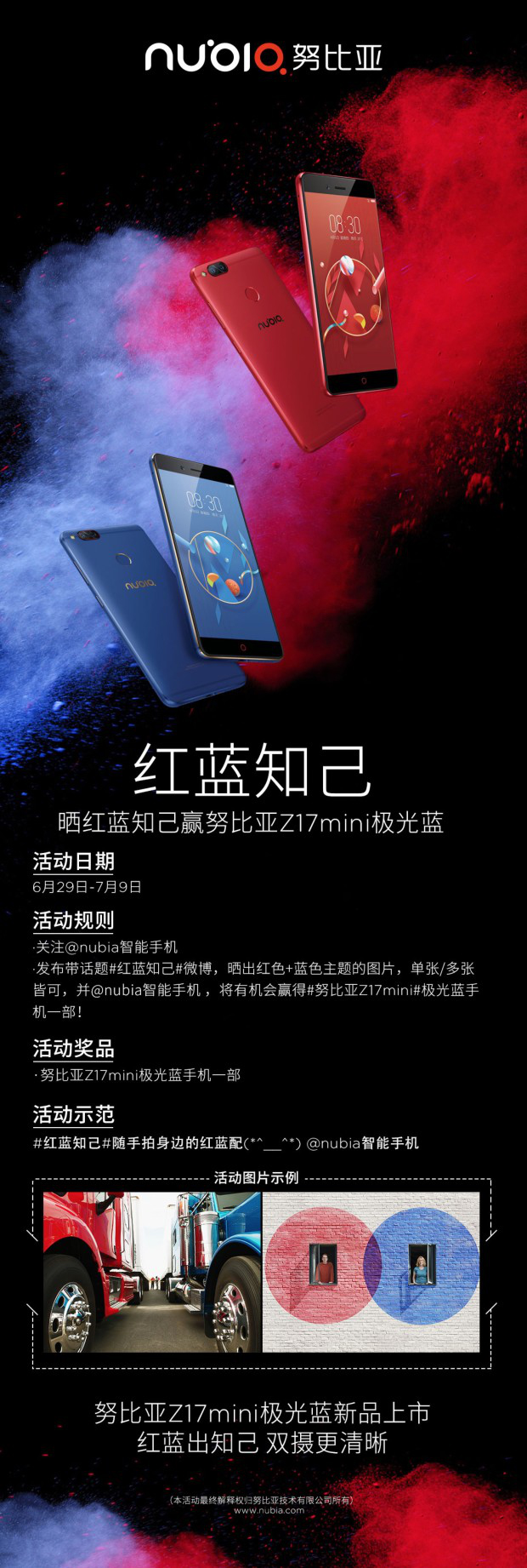 一红一蓝,想必用来做情侣机是极好的选择,这种浓浓的暗示,或许能促使两人之间的爱意更加升华。另外,努比亚官方还推出了一项好玩的活动,9号之前在微博中晒出“红色+蓝色”主题的图片,@nubia智能手机,就有机会赢得Z17mini极光蓝手机一部!