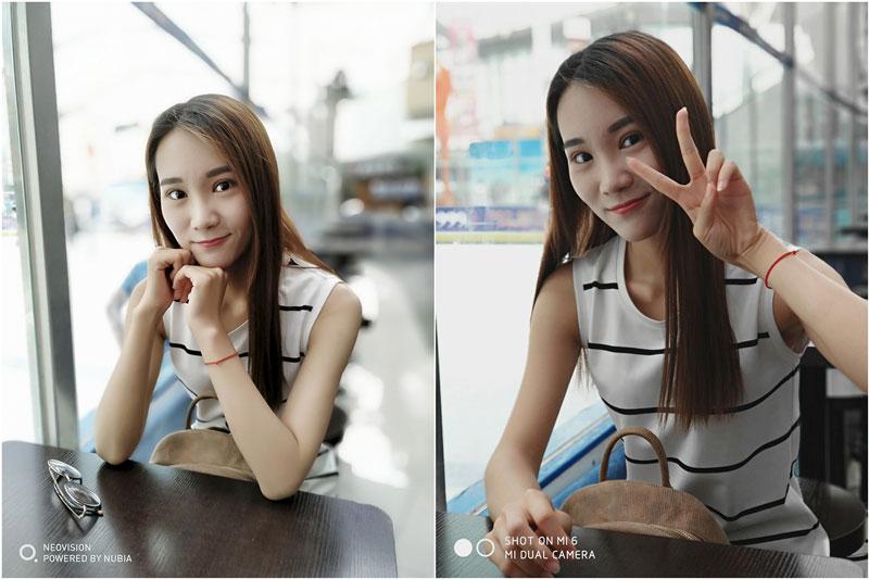 第二组图是在室外的一个咖啡店拍的,依然是左边努比亚,右边小米。通过这组图的对比,努比亚的优势更加明显了,背景虚化程度和人像美颜效果完美结合。小米6给予了我们一种雾蒙蒙的表现,和Z17存在着一定的差距。