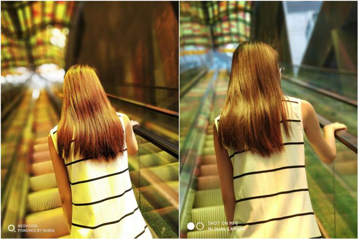 我记得这张图是在地铁的电梯上拍的,属于比较复杂的室外背景。左面一张是用我的努比亚Z17拍的,右面的是女朋友的小米6拍的。相比之下,努比亚Z17的背景虚化程度无疑更饱满的,而小米6相对来说虚化程度较为平淡。而且从色彩上来看,努比亚Z17颜色也更加饱满,显得十分自然,肩部头发的细节也保持的非常好。在这点小米6的劣势就比较明显了,颜色暗淡有一种解析力不够的感觉,整体画面不如Z17纯净。