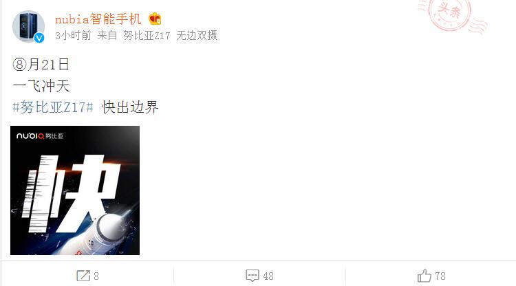 【CN314智能生活】自从努比亚年度旗舰Z17发布以来,业内对该机的讨论就没有停止过,玩家圈子里针对该机的各种脑洞大开的玩法也层出不穷。比如说2300W+1200W像素无损变焦双摄所带来的丰富摄影玩法就广受玩家们好评。值得注意的是,努比亚官微今天早些时候再次放出一张预热海报,硕大的“快”字与海报中的火箭几乎融为一体,而火箭上红色的数字“8”也引起了人们的关注。