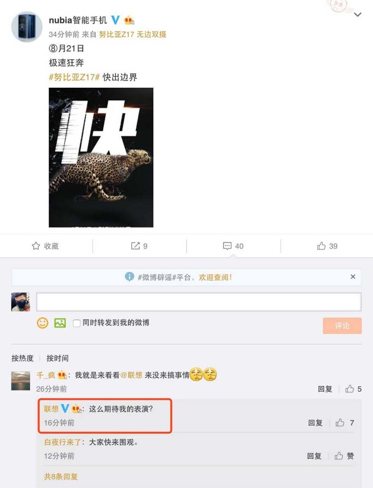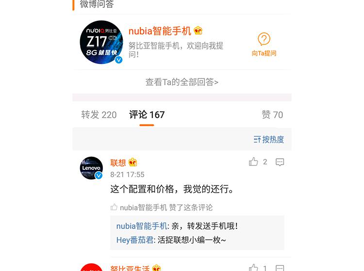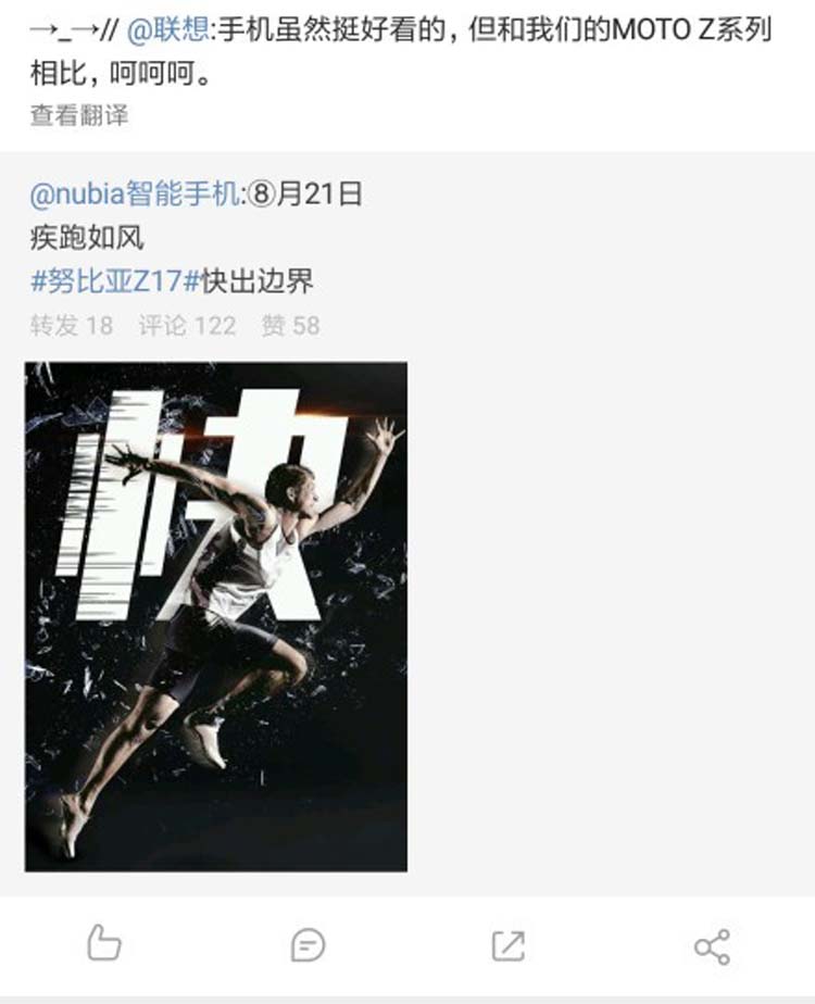 在努比亚关于Z17新品发布会的宣传微博下面,联想官微“开口”说了一句:“手机虽然挺好看的,但和我们的MOTO Z系列相比,呵呵呵。”这句评论一出瞬间就成了各界人士关注的焦点。