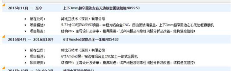 在这份简历中,已经很明确的标示这位产品经理是任职于努比亚,并且从项目时间来看,努比亚居然从去年11月份开始就着手全面屏手机的开发了,这简直让人惊讶。要知道去年11月份的时候很多品牌依旧在窄边框、指纹识别、曲面屏等领域发力,有关全面屏的消息少之又少。而简历中载明“5.73英寸COF屏、四曲面玻璃后盖、上下3mm超窄黑边”,对网友们、玩家们来说无疑具有强大的吸引力,如果这份简历内容确切属实的话,那么努比亚这款全面屏旗舰真是屌炸了。