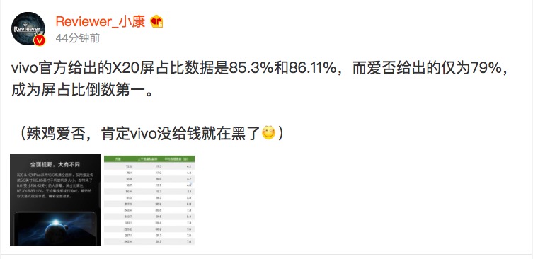【CN314智能生活】昨天vivo X20手机震撼发布,真是搞了个大新闻!且不说这款手机怎么样,至少是把vivo带入了“全面屏时代”,终于有资本跟一众大佬们比个高下了。值得注意的是,昨天X20发布结束之后,有关该机的口水就开始了,那就是关于屏占比。并且还真有细心网友给出了数据:不管是人们口中的70%多屏占比还是官方给出的80%多,都是不到90%,甚至还有人用游标卡尺测量出了X20的边框数据并进行计算,真的没有达到90%!
