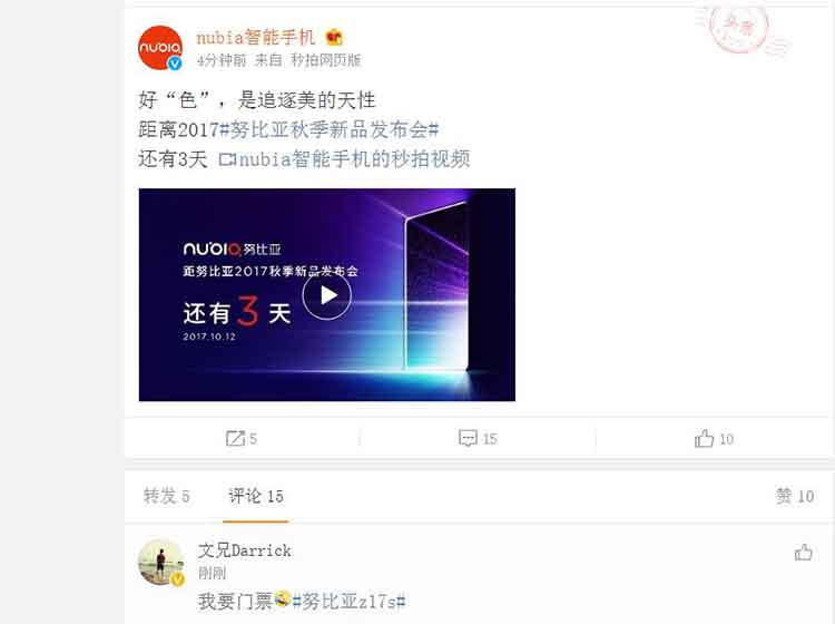 视频中透露的信息是实在有限,不过不用着急,10月12日在深圳前海华侨城JW万豪酒店的发布会,相信这款努比亚Z17S一定能给我们一个大大的惊喜。