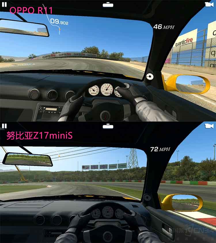 下面就是两款手机游戏中的截图,上为OPPO R11,下为努比亚Z17miniS。我们可以看到两台手机的画面效果都不错,无论3D渲染还是画面过渡都十分出色,尤其是选择车内视角之下,仿佛置身于真实赛道一般,游戏沉浸感十分明显。看来两款手机的高通骁龙6系处理器面对这种大型3D游戏还是游刃有余,毕竟GPU方面一直是高通的强项。
