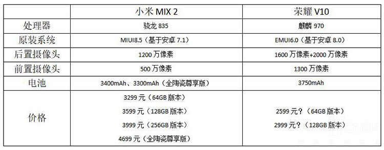 性能方面,麒麟970与骁龙835在性能上旗鼓相当,但是麒麟970内置AI引擎通过NPU神经元计算,可以比传统手机芯片在图片识别、系统运行上带来更快的运行速度,同时让系统长时间使用保持流畅。拍照方面,算是小米MIX 2的弱项,那样的配置甚至比不上很多入门机,就不多提。续航方面,荣耀V10电池容量更大,最高22.5W的SuperCharge快充也是小米MIX 2不能比的。最后就是价格,如果最终发布的售价如爆料这样,那么荣耀V10就太具优势,它的综合性能略高于小米MIX 2,售价却便宜太多。当然,有时候情怀也是我们选择的重要依据。