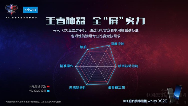 在前段时间,vivo X20经《王者荣耀》KPL官方认证,通过严苛的赛事用机测试标准成为KPL官方赛事用机,同时vivo X20也成为安卓阵营第一款通过该项测试的手机!想要通过这项标准,必需通过长时间,在职业赛场环境下测试,针对游戏中的帧率波动控制,精准操作,续航,温度控制,设备稳定性,网络稳定性六大指标进行多局测试,最终得出结果,vivo X20能通过层层测试,成为玩王者荣耀的“神器”,可见其实力之深厚。