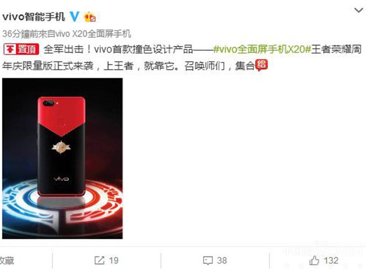 【CN314智能生活】vivo作为全球领先的手机厂商,一向以追求极致,致力于为年轻用户带来更多乐趣、创造更多惊喜作为品牌口号。而《王者荣耀》作为当下年轻群体热爱的MOBA手游,自诞生以来一直为广大玩家带来欢乐和乐趣。为了让玩家从内而外沉浸在王者荣耀的游戏世界,vivo决定联合王者荣耀共同推出vivo X20王者荣耀周年庆限量版。继昨日透露了vivo X20王者荣耀周年庆限量版的局部图之后,今天vivo官方再次放出消息,vivo X20王者荣耀周年庆限量版的造型全面曝光。