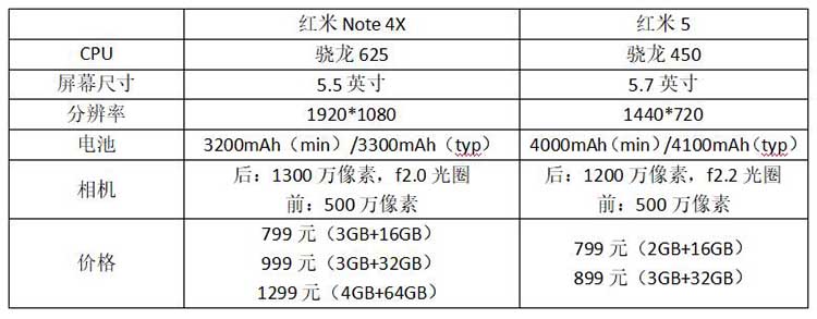 通过上述表格,我们可以清晰的对比两款手机的参数。红米5较红米Note 4X而言,屏幕大了一点,但电池容量却砍掉一大截,分辨率也不升反降,配了一个早就落伍的720p。拍照方面,像素削低了,光圈也缩小了。另外,两款手机处理器完全不是一个档次的。但是,它们的价格却基本持平,就因为红米5尺寸更大,多花了一点边角料,并附了一个边框可以跑马的全面屏?