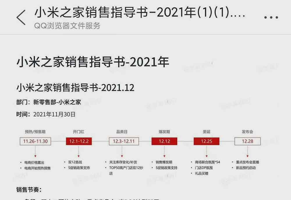 从某网友爆料的小米之家销售指导书来看,小米在12月28日会有一场重点发布会,会是什么产品的发布会呢?我猜测应该就是小米12系列。去年小米11的发布时间也是12月28日,这就大概就对得上了,与高通旗舰芯片的发布会(都是12月1日)相隔27天,所以小米12很大概率是在月底发布,也就是12月28日。
