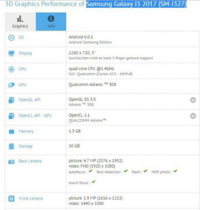 最近在GFXBench数据库中出现了三星新机Galaxy J3 2017的配置列表,虽然J系列作为三星入门级的手机,但是手机的配置却有点惨不忍睹,大有像HTC看齐的趋势。三星Galaxy J3 (2017)配备5英寸720P显示屏,搭载1.4GHz骁龙425处理器,辅以1.5GB RAM+16GB ROM组合,前置200W像素摄像头,后置500W像素摄像头,电池容量为2600mAh,预装Android 6.0.1操作系统。可以说现在市面上应该很少能找到一款1.5GB运行内存的手机,但是三星做到了。
