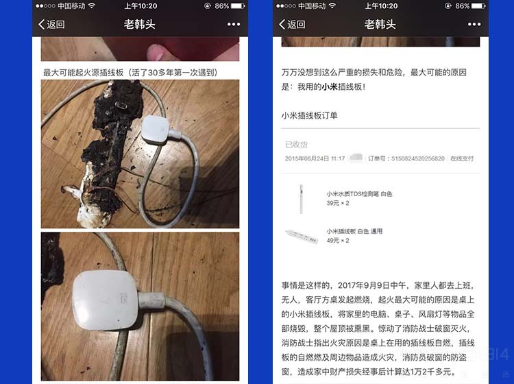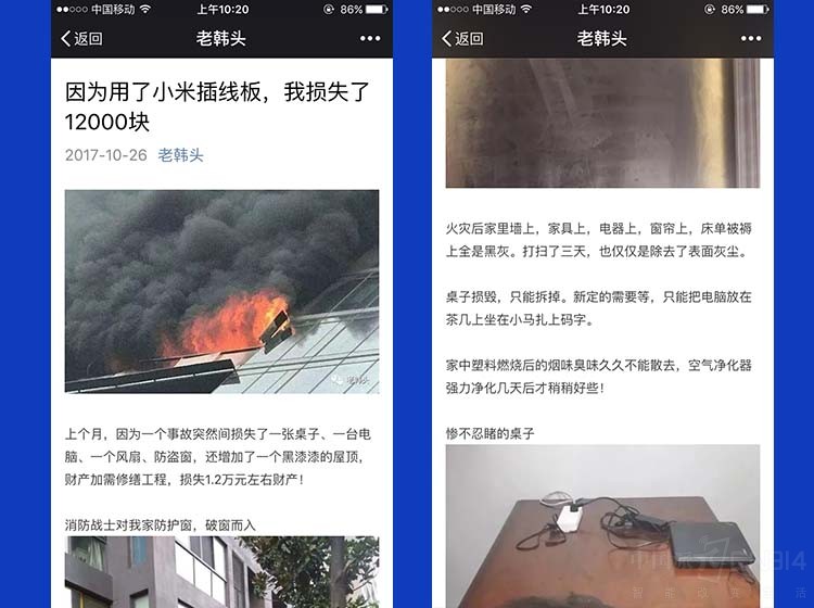 【CN314智能生活】小米又双叒叕自燃了,这次不是手机而是插线板,据当事人称直接损失达一万二。其实这件事已经发生了一个多月,但是因为小米售后一直没有给出合理的解释,只愿意拿出几千元抚恤金,不承认小米插线板有问题,才被当事人传到自媒体平台。
