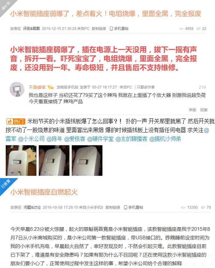 当然,这已经不是小米插线板第一次出问题。很多朋友都在小米社区等各大论坛反应过这一现状,但是小米的官方一直没有给予明确的回复,总是想大事化小,小事化了。这不是一个大企业应有的行为,毕竟这已经严重危害到消费者的生命财产安全。当年三星、丰田在产品出现问题后,成立了相应的调查组,将问题产品召回,虽然损失惨重,但是挽回了一定的信誉。如果一个企业缺乏基本的社会责任,那么它可能会被市场所淘汰。