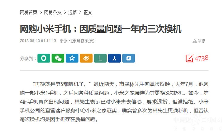 《经济参考报》的记者就曾收到来自郑州、广东、北京等地对小米手机的投诉,“死机、黑屏、机身发烫”纷纷成为了投诉点,售后服务也难以让人满意。在《北京晨报》中,一位林先生在一年内甚至接连换了三次小米手机,屏幕、卡槽、自动关机等都是其换机的主要原因。