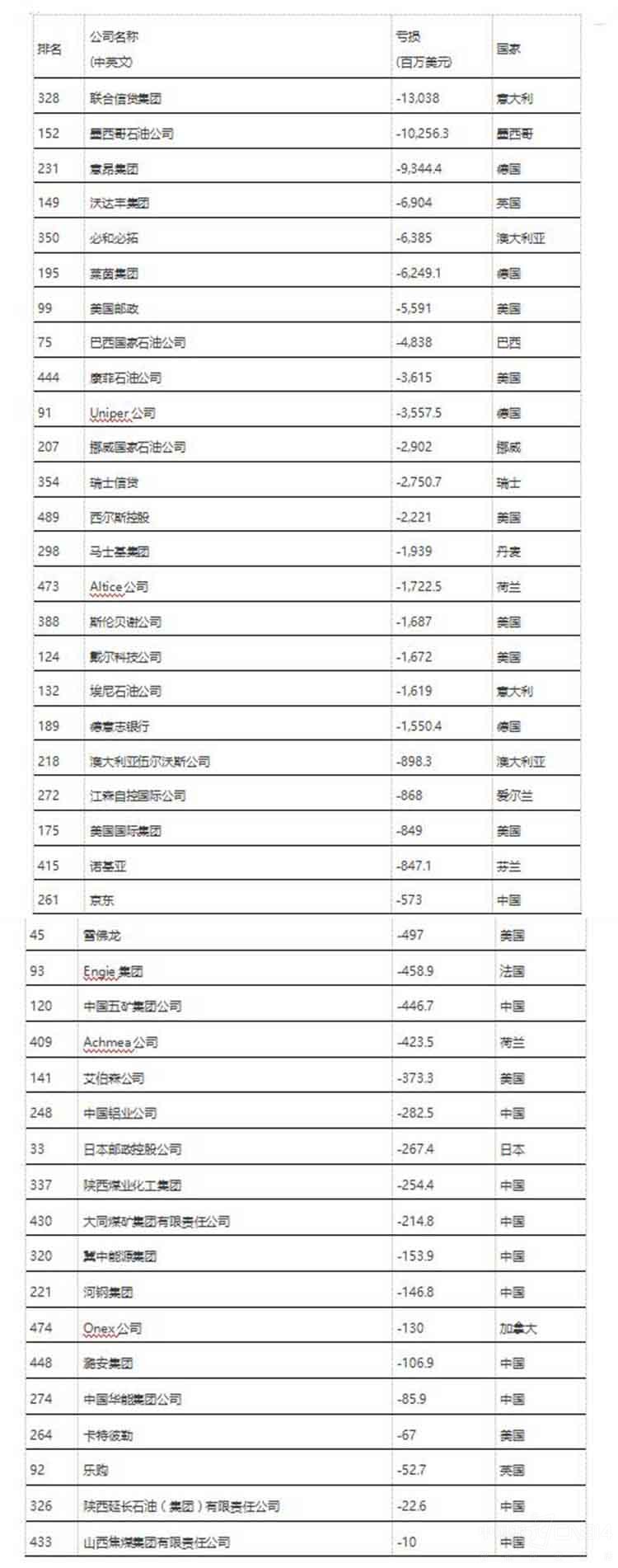 据中国经济网消息,最新一期的500强亏损公司榜单上,意大利的联合信贷集团亏损130.38亿美元,成为亏损最多的公司。墨西哥石油公司(亏损102.56亿美元)、德国的意昂集团(亏损93.44亿美元)、英国的沃达丰集团(亏损69.04亿美元)、澳大利亚的必和必拓(亏损63.85亿美元)分列亏损榜第二到五位。中国有11家企业上榜,居首的就是大名鼎鼎的京东,亏损5.73亿美元。