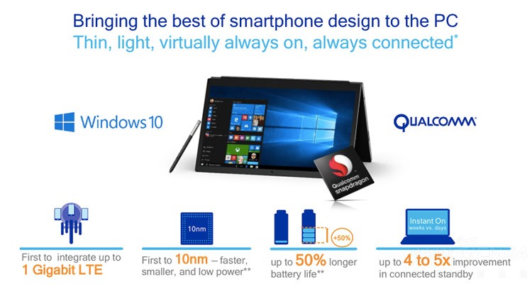 根据高通公布的数据,在播放Netflix流媒体视频时,相关设备的续航时间可达到28-29个小时;如果是在Wi-Fi或LTE网络下上网,相关设备的续航时间可达到20小时左右,这样的成绩可以说远超英特尔。
