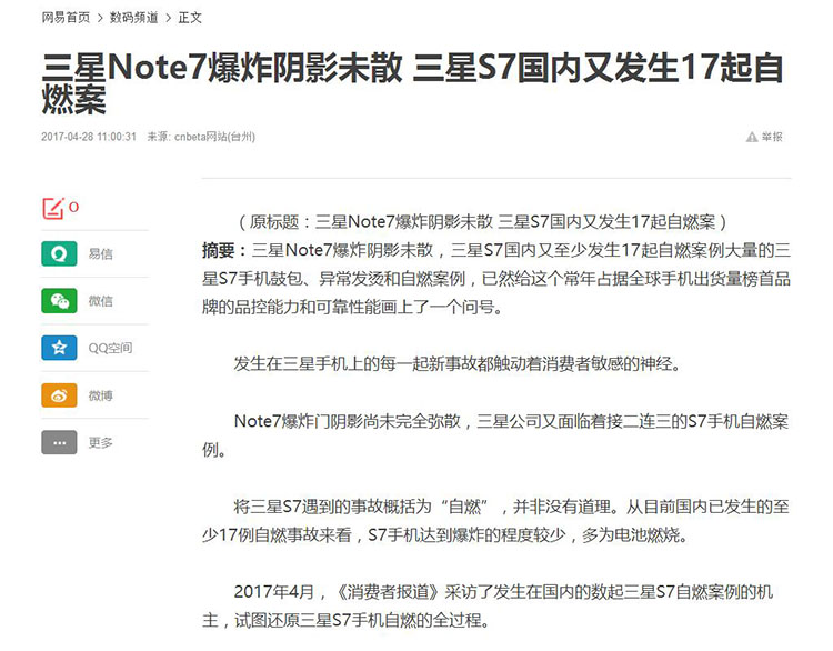 电池爆炸可以说是三星永远的痛,即便三星Note 7大批召回以后,依旧会听到三星手机自燃的消息,比如三星S7,据媒体披露,这款手机截止去年5月就发生了17起自燃案,吓“哭”了不少消费者。