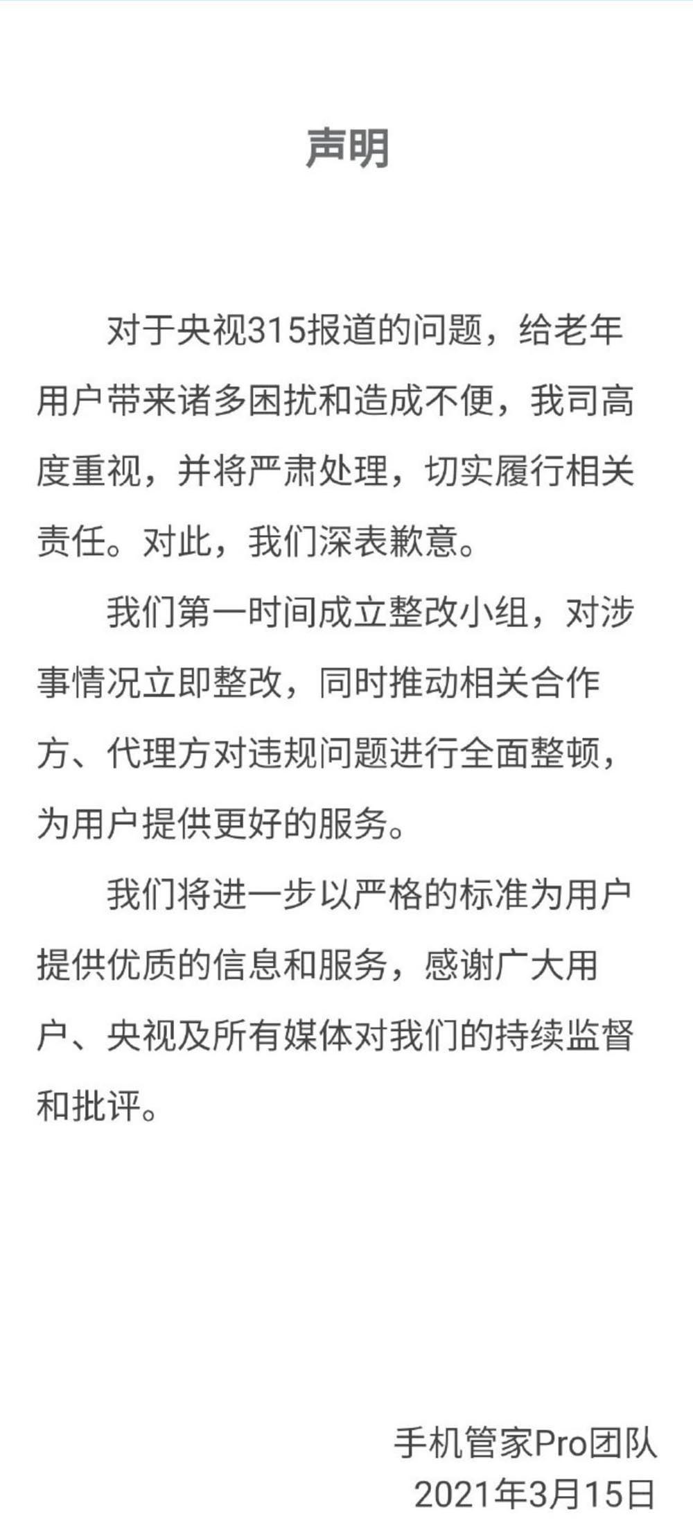 手机管家Pro开发商安狗狗(深圳)信息技术有限公司发布了致歉声明。安狗狗表示,对此深表歉意,将严肃处理央视曝光相关问题,切实履行相关责任。