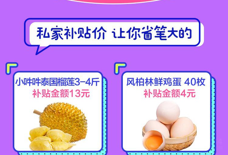 白来是不可能的,就像逢年过节去奶奶家吃饭,来的时候瘦成猴,走的时候胖成猪。为了照顾广大羊毛党,苏宁超市的补贴力度也是蛮大的,泰国榴莲3-4斤单个补贴价只要你自己掏69元,鲜鸡蛋40枚还不到25元,维达纸抽20包不到27元,苏菲日夜组合59片装不到25元——难道苏宁超市就是传说中的“福利姬”?
