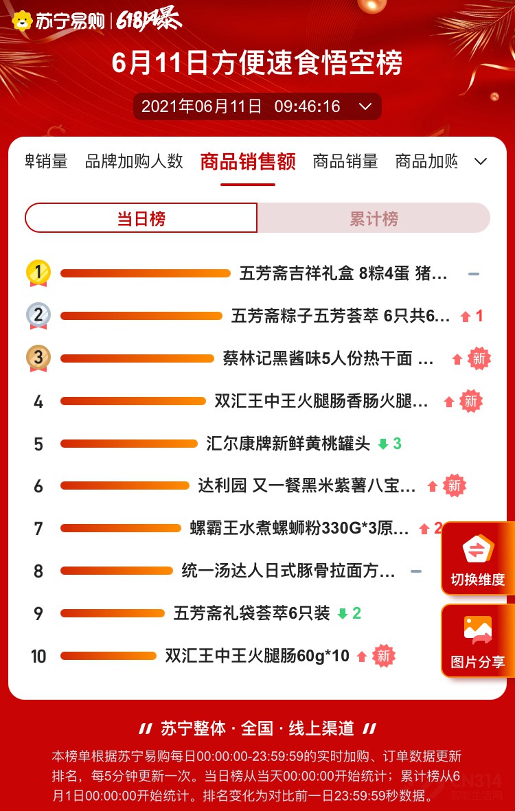既然要吃吃喝喝,那么苏宁超市就是绕不过去的了,时逢618和端午节,苏宁超市快消美食板块的动向大家都能猜到,粽子一定会大卖。到今天上午10点左右,五芳斋的两款粽子套装卖得相当火爆,直接包揽了单品销售额的前两名。而前几天一直都很火热的汇尔康黄桃罐头则掉出了前三。可见端午节在大家心中的地位有多高了,一方面是中华文化,另一方面则是大快朵颐。