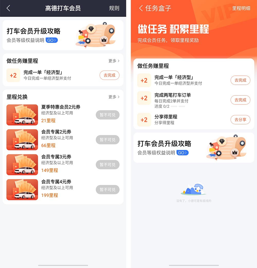 对于经常打车的会员用户,高德打车还上线了里程玩法,完成相应的任务就可获得相应的里程,而里程可以兑换各种价值的优惠券。简单来说,打车越多,越容易兑换里程,享受的打车优惠也越多。