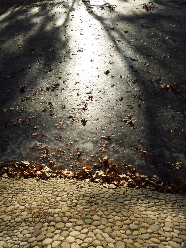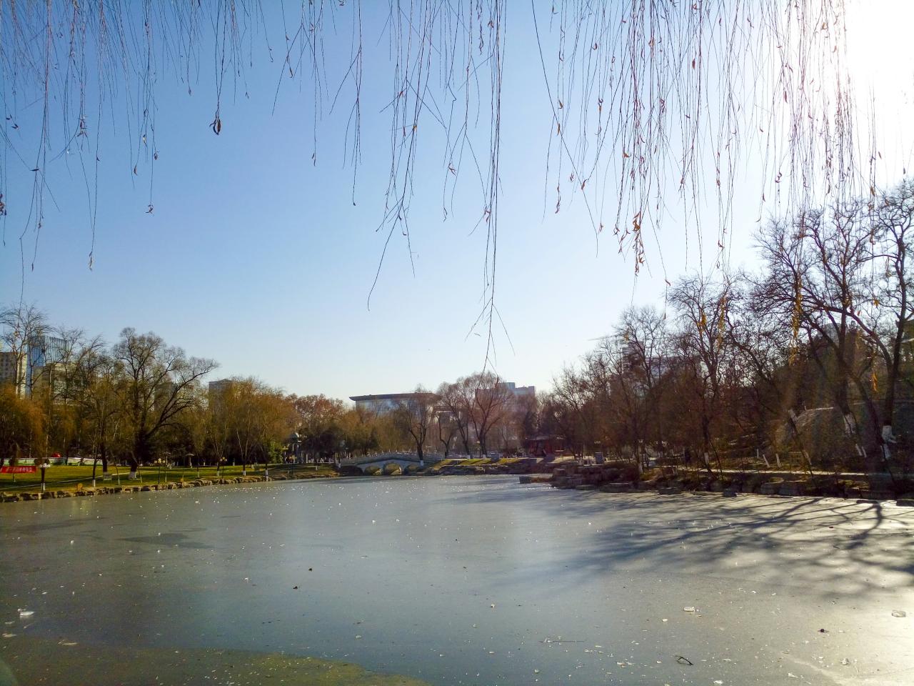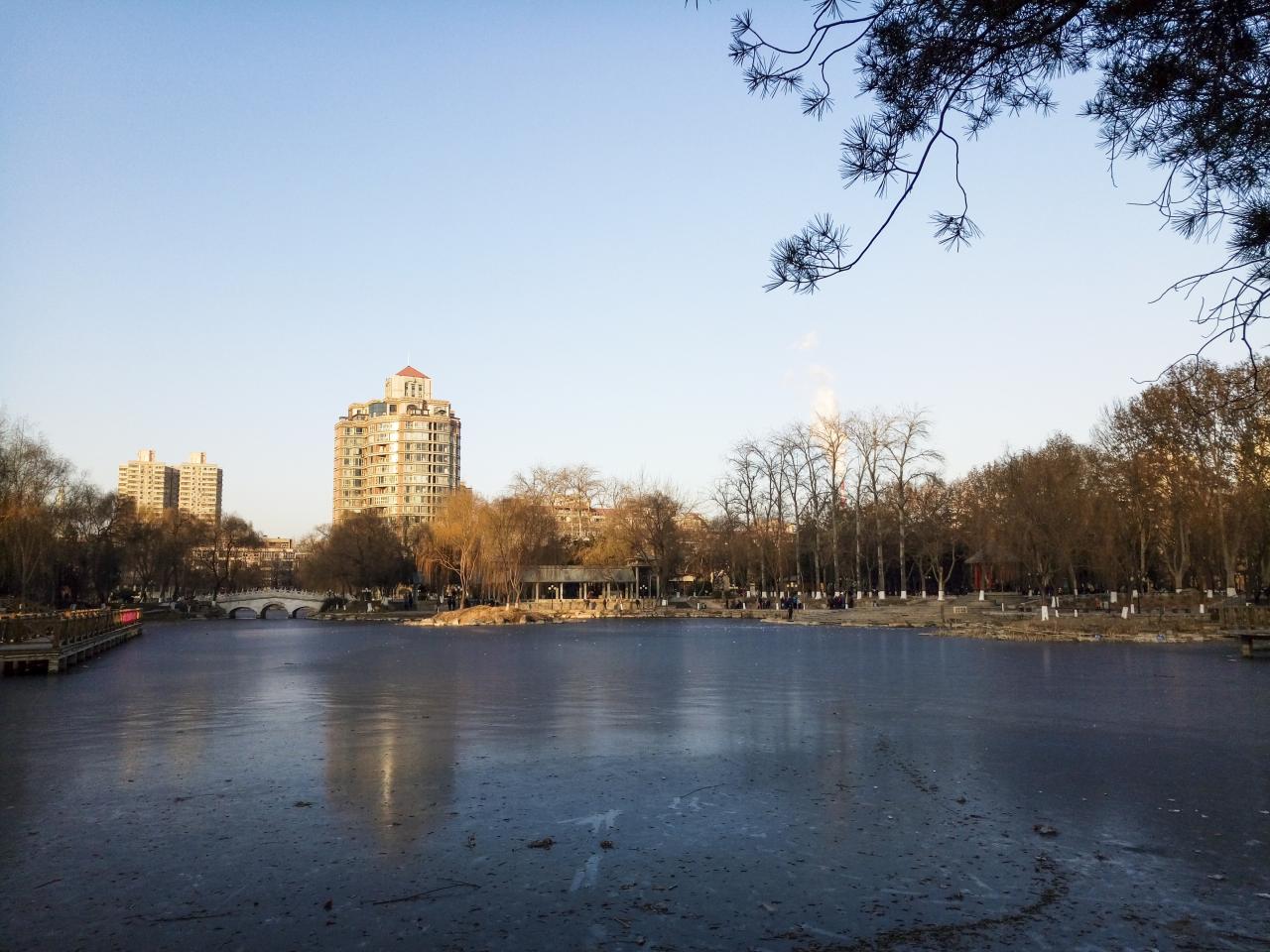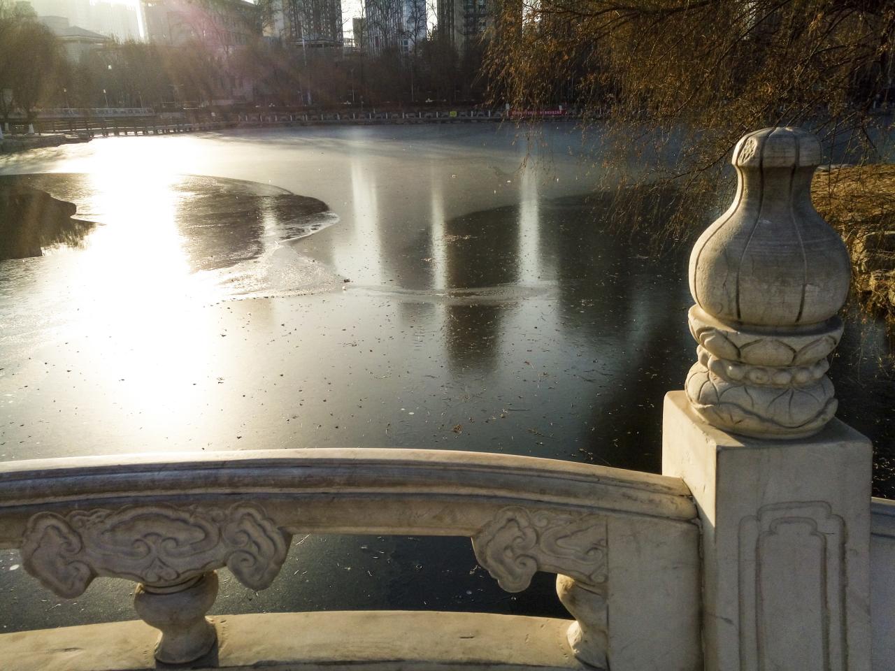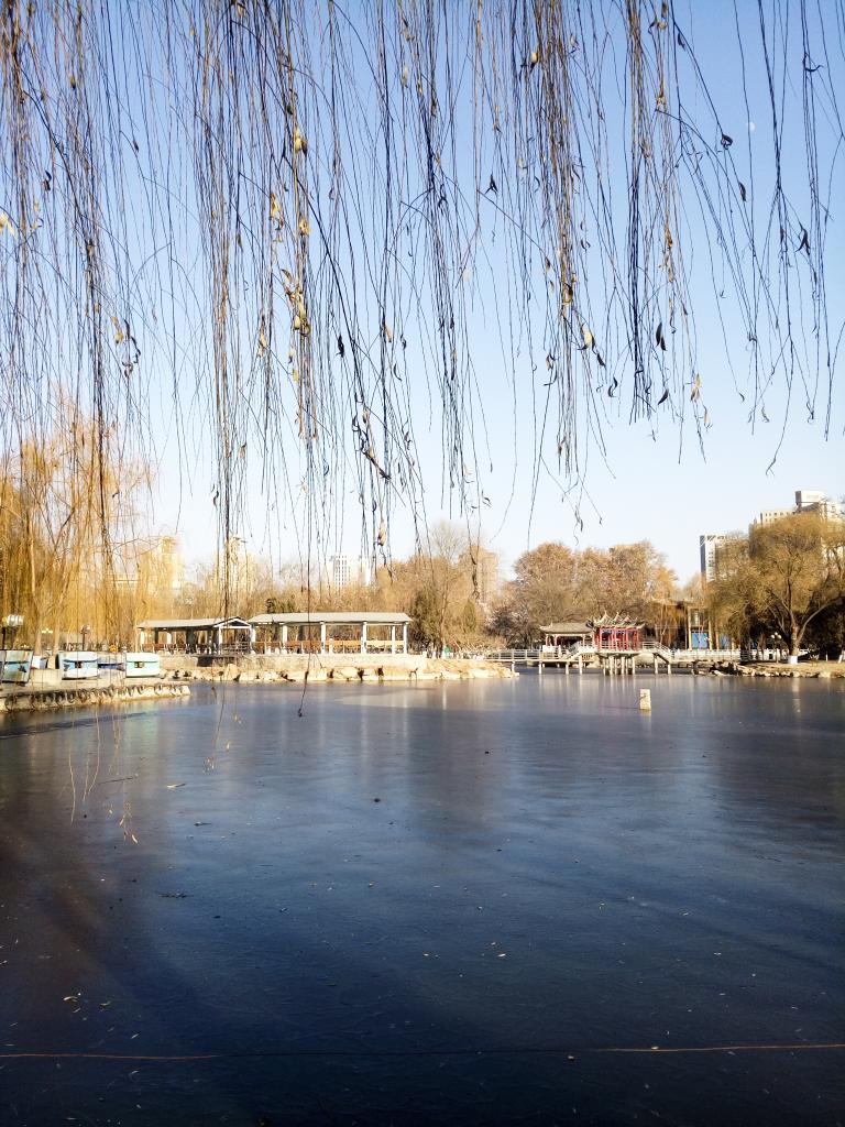 第1天 湖面结冰,不知道厚不厚,我不敢踩上去走。。公园里的保安也不让!