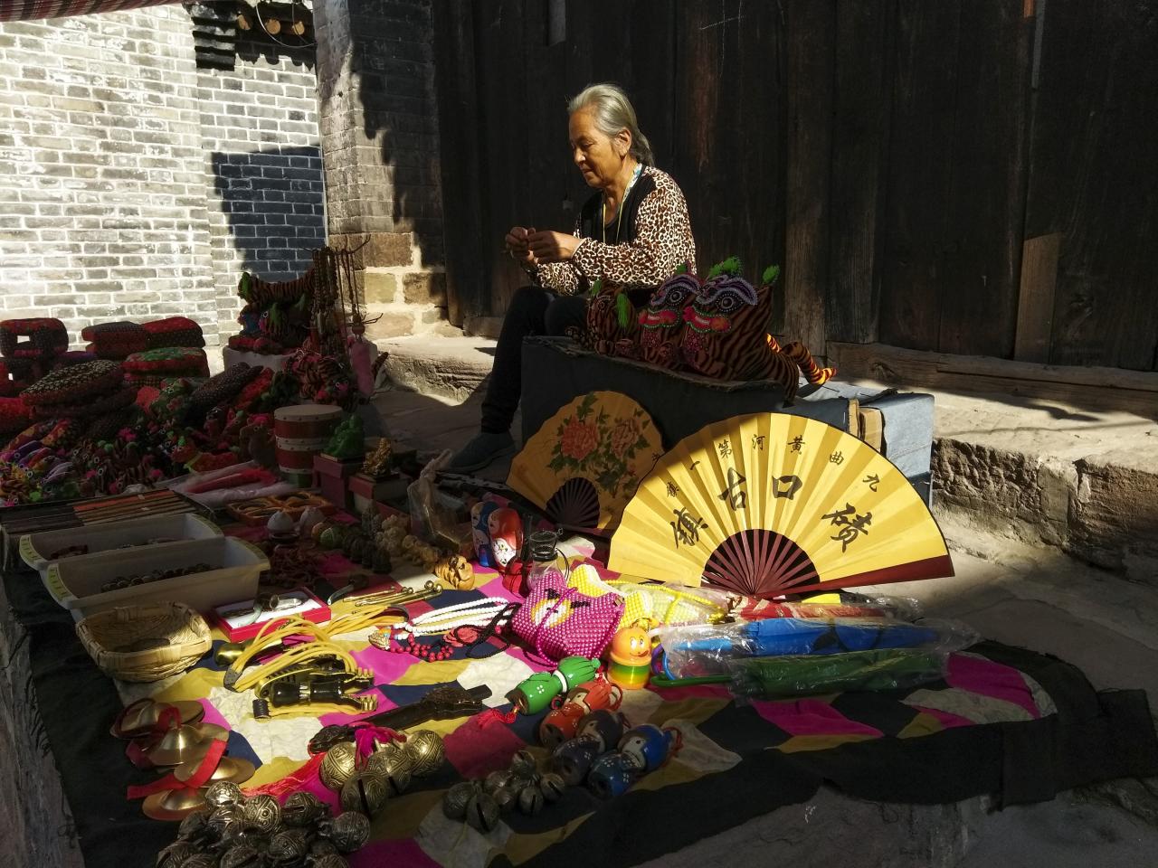 第1天 古镇中卖各种工艺品的老奶奶,利用光线将扇子和老奶奶突出出来。