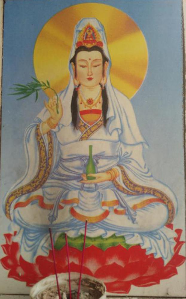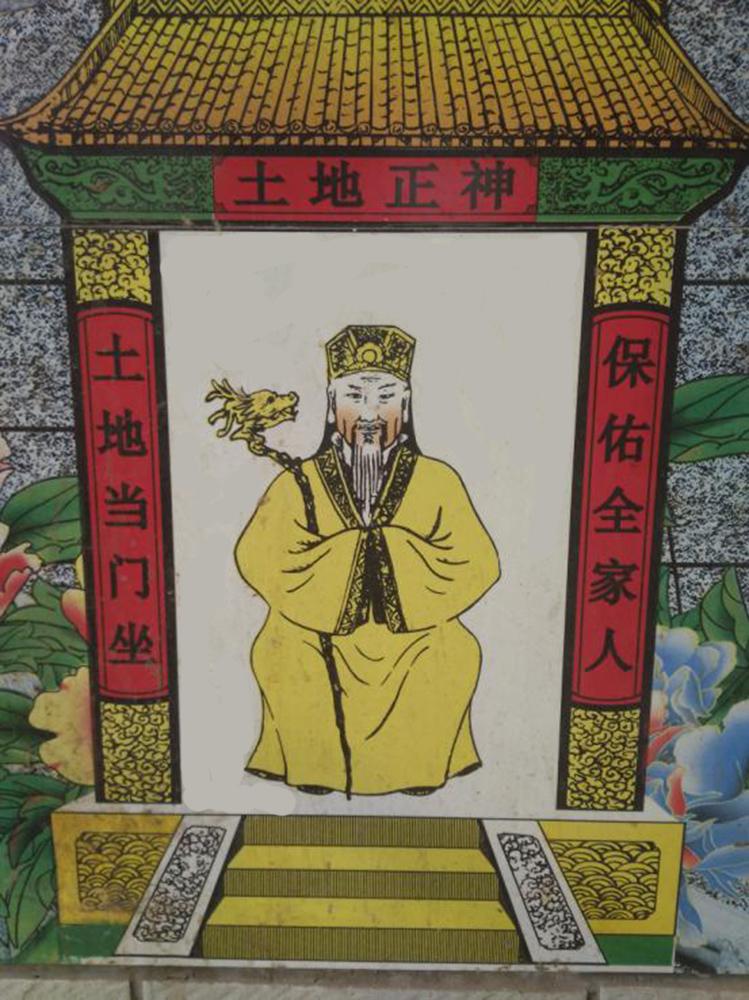 第1天 还有在大门正对面的墙上张贴土地神,神灵码最原始是雕刻在墙上的,后来造纸术和印刷技术的成熟,改为张贴神灵码,但近几年随着瓷砖烧制的先进,土地和南海观音一般都被印制在墙上。