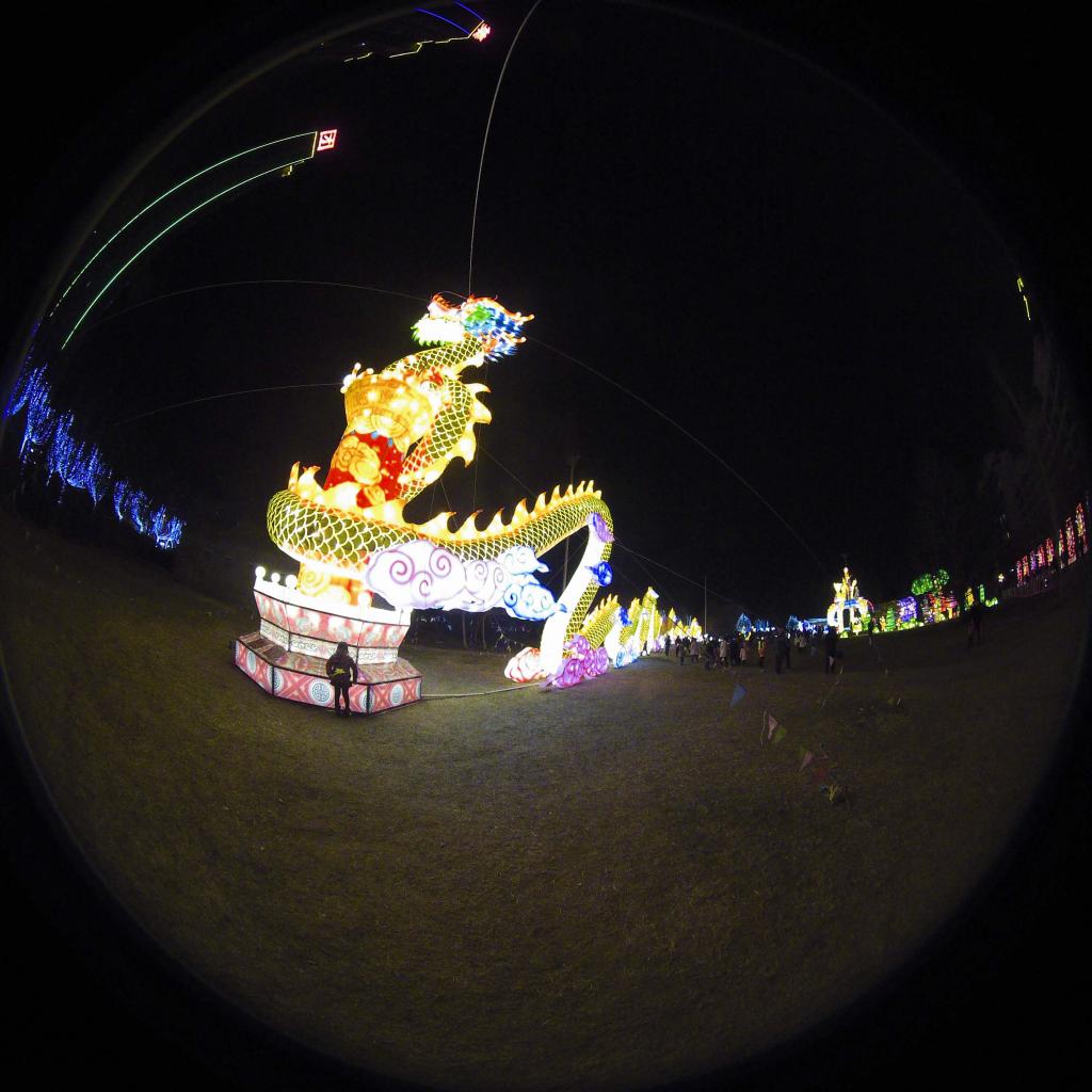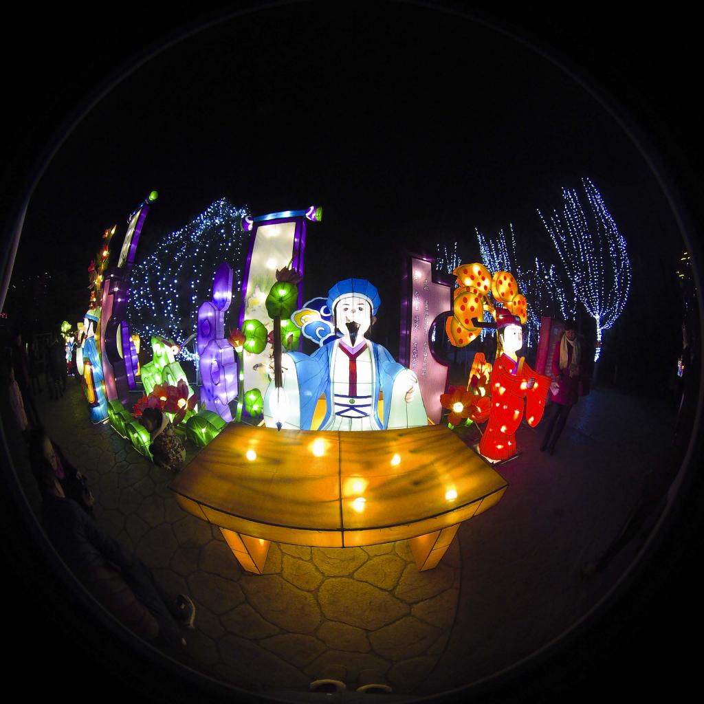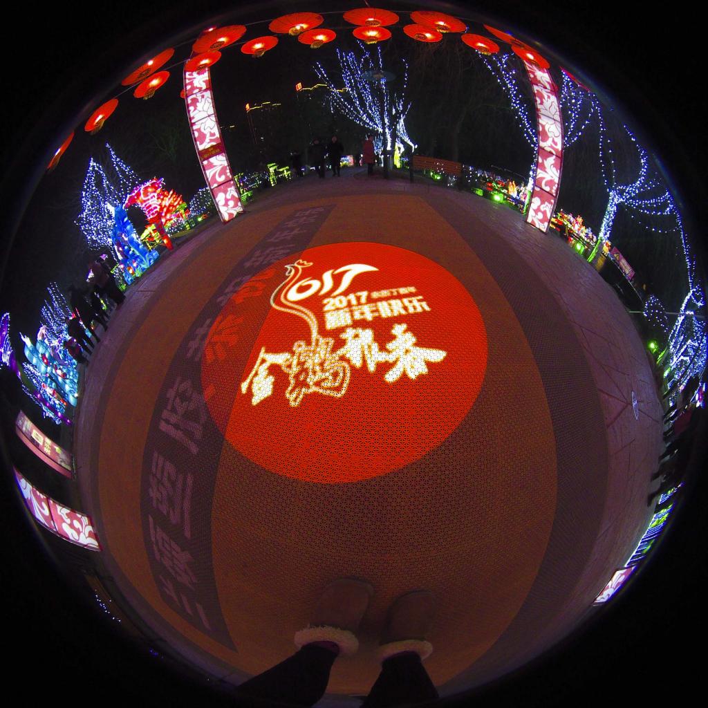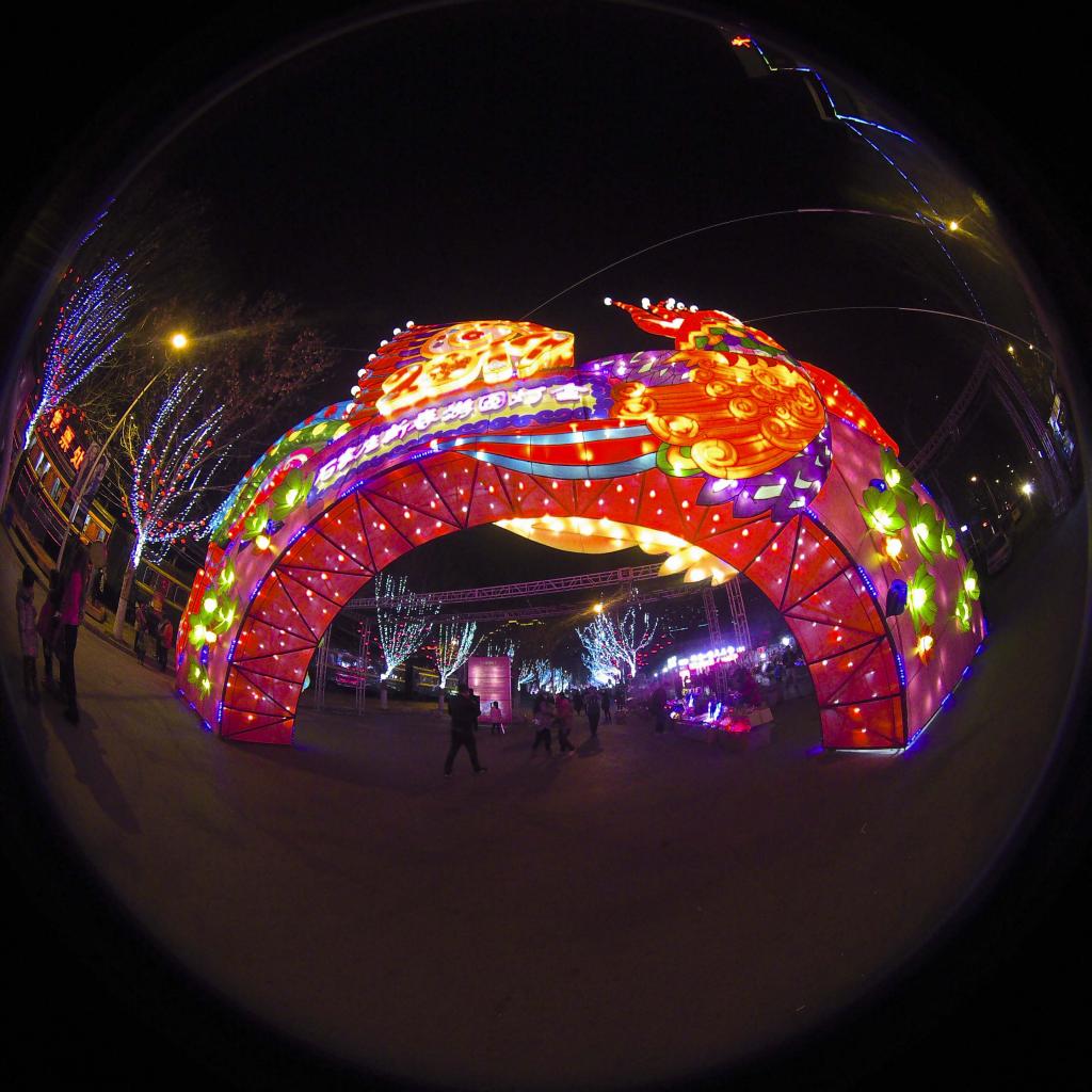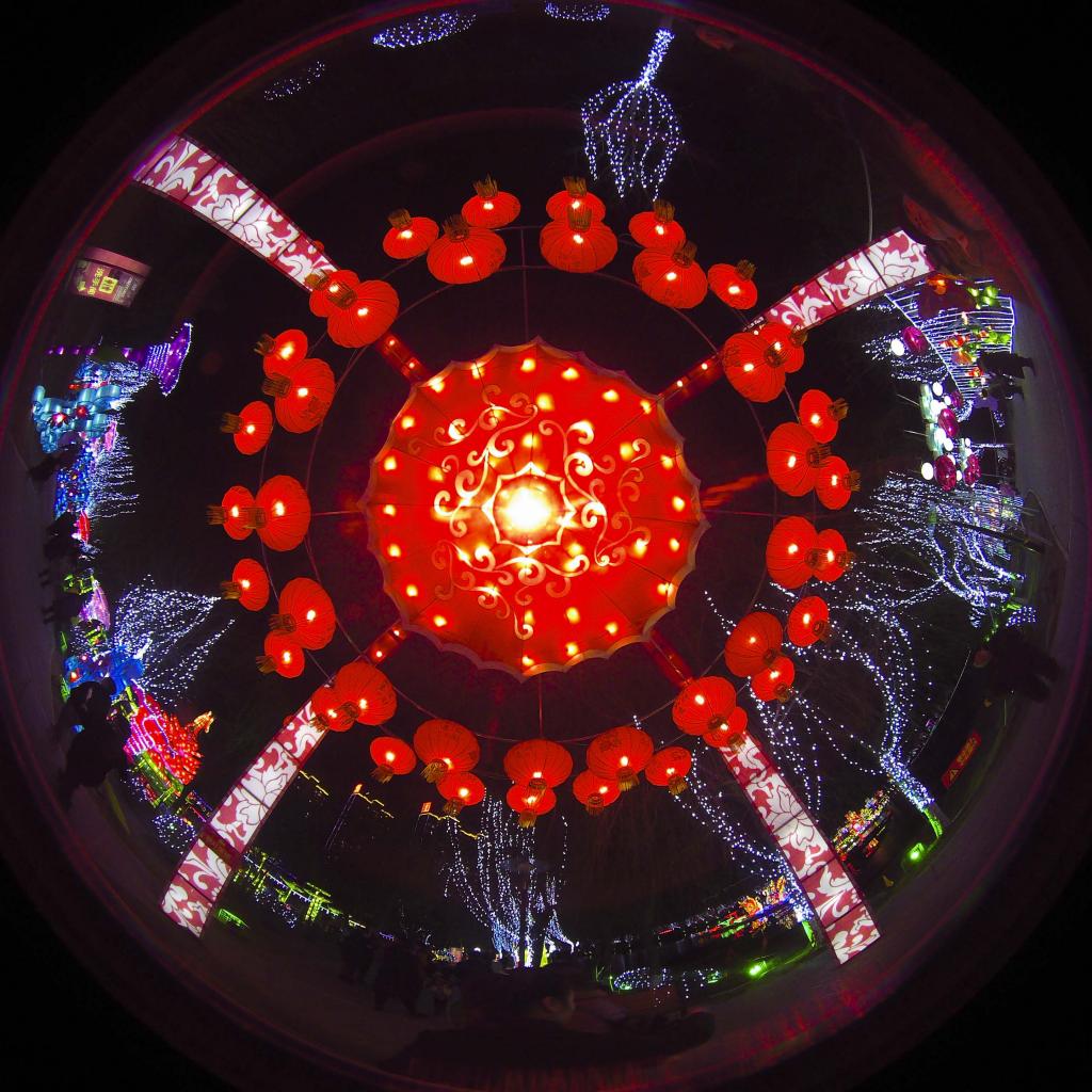 第1天 过年啦花灯组合,Camorama4K全景摄像机能够离着花灯非常近把十米长的花灯组合拍摄到一个画面中。