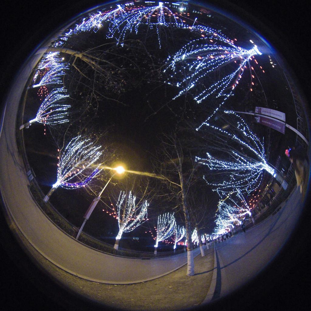 第1天 从大门进入后是一条通往圆内的小路,书上都挂满了彩灯和小红灯笼,漫步在小路上,陶醉在彩灯艺术赋予的独有神韵之中。利用Camorama4K全景摄像机拍摄出树枝上很多灯的效果。