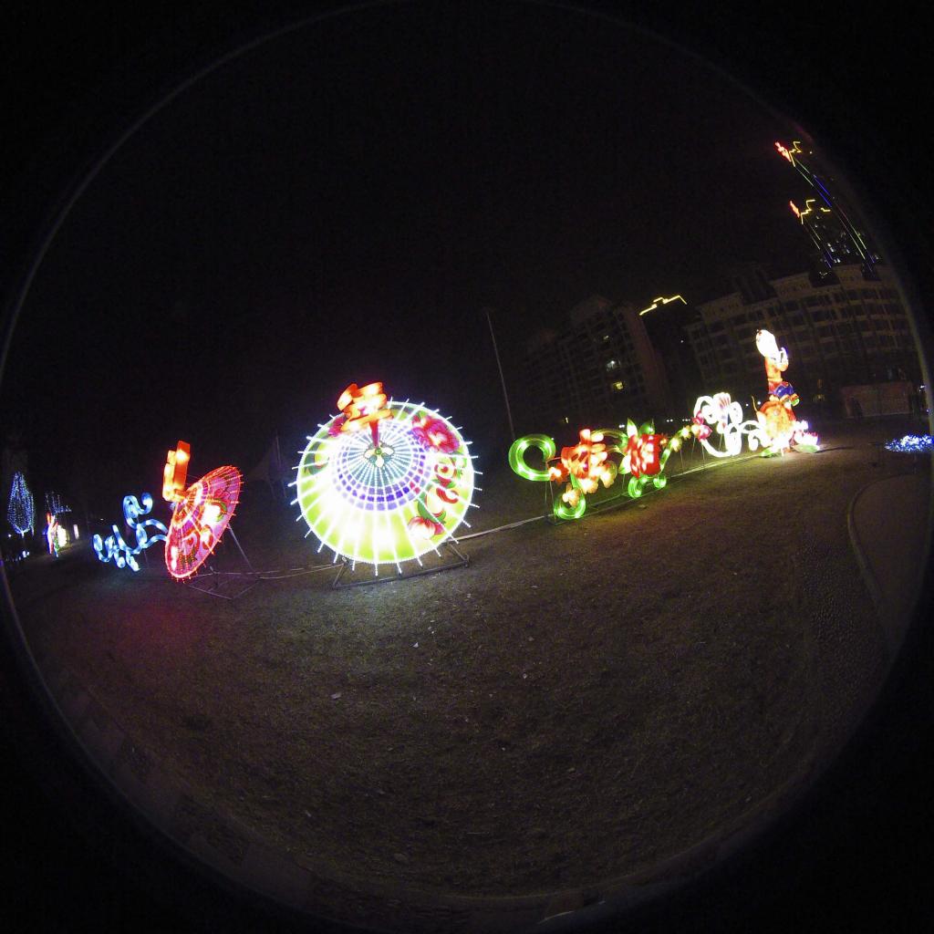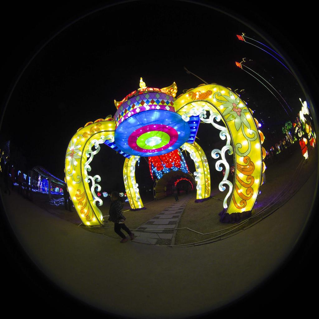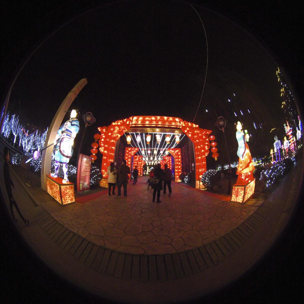 第1天 从这里就开始正式游览园区啦,过年了,看见彩灯,心里好开心,正常手机是拍不出这个大门的,不过我带了这个Camorama4K全景摄像机,可以360度拍摄,拍这种大场景,堪称完美。