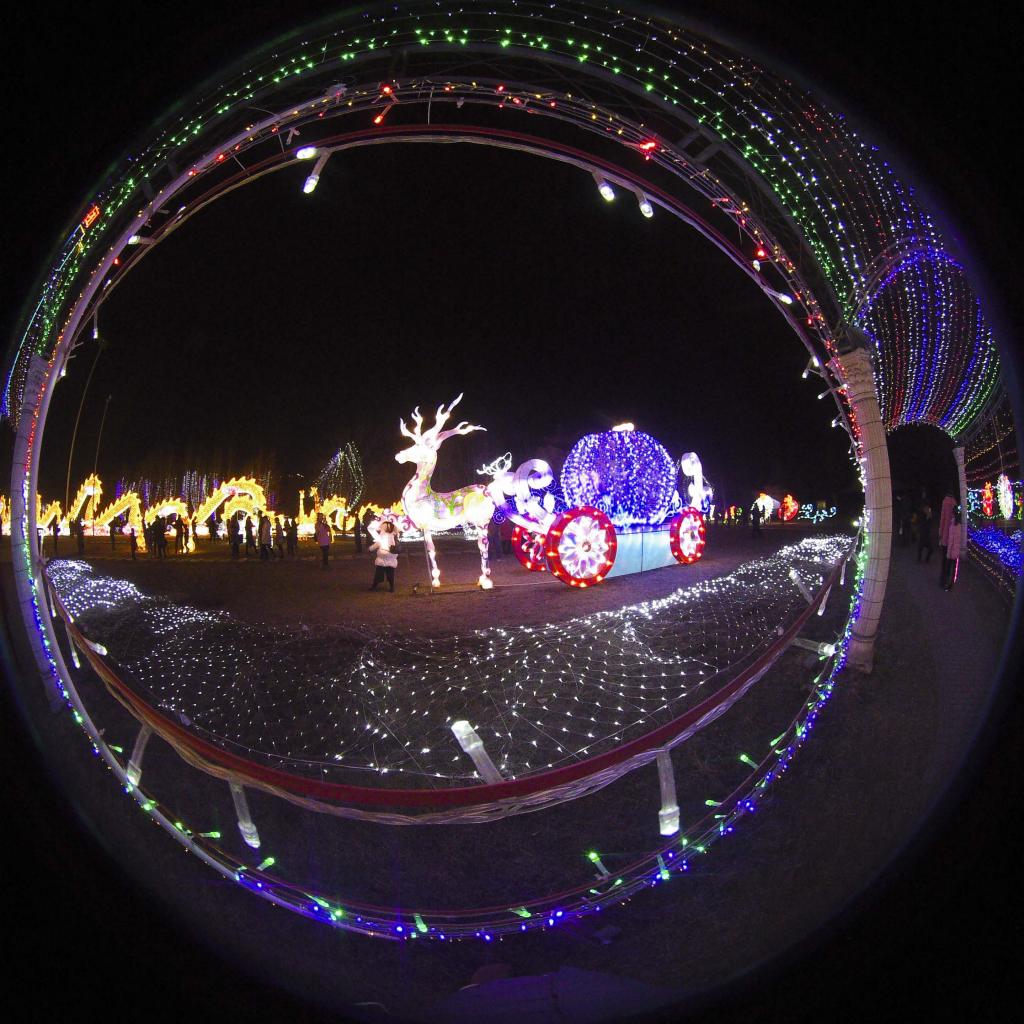 第1天 最喜欢的一张照片,透过彩灯看南瓜车,麋鹿的造型非常灵动。将彩灯作为前景,Camorama4K全景摄像机将彩灯拍摄成了一个圆形,穿过圆形看南瓜车,形成一个画中画构图。