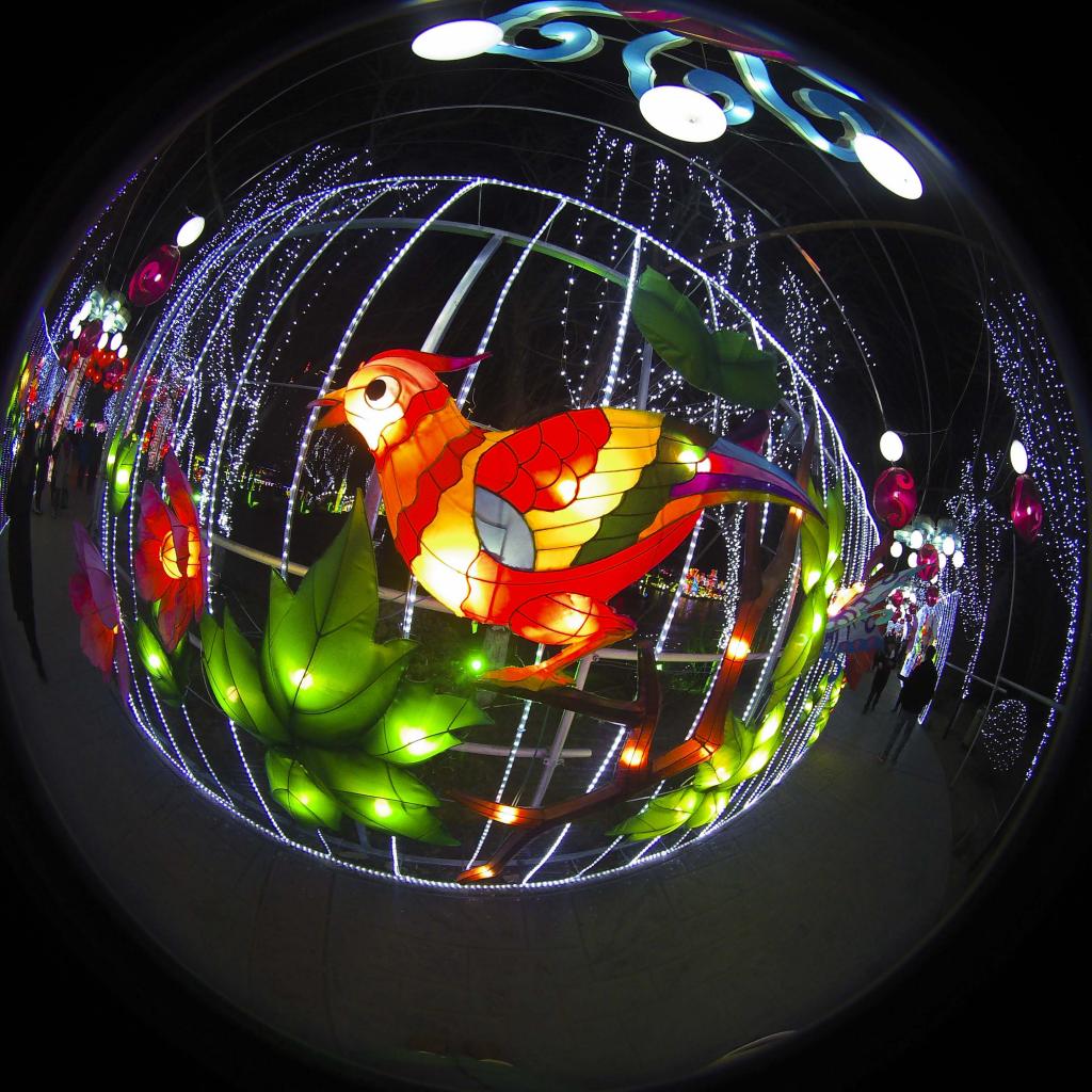 第1天 惟妙惟肖的小鸟,自贡的百位非遗文化传人,结合传统的制灯工艺和现代科学技术,打样—搭骨架—裱糊—装灯—造景,历时一个月纯手工打造而成。利用全景相机将小鸟放大,既能看出小鸟的细节,又能突出主题。