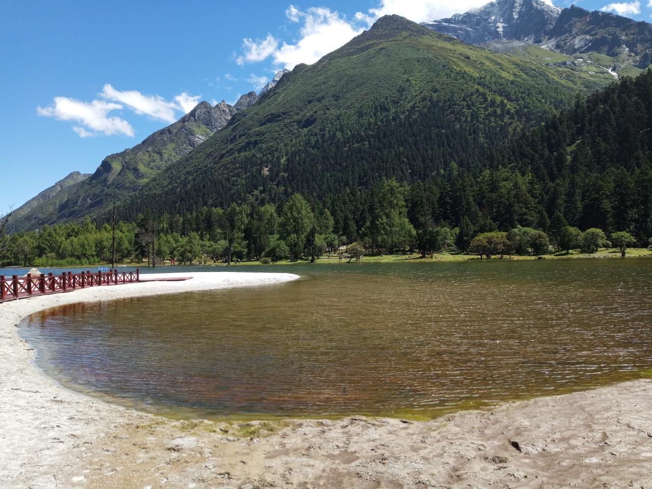 第1天 为了方便顾客近距离欣赏风景,火红色的木桥搭建在了湖水上,这项人文建筑,一下把人与大自然的距离拉近了不少。