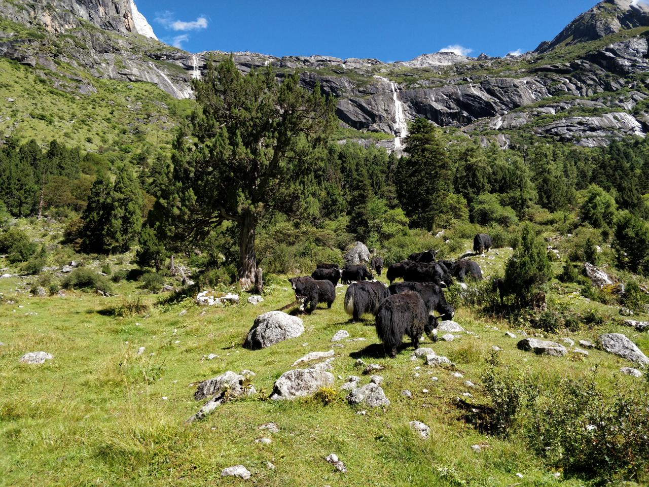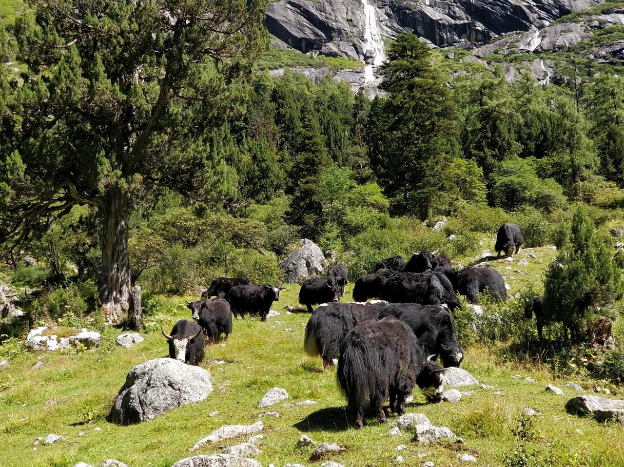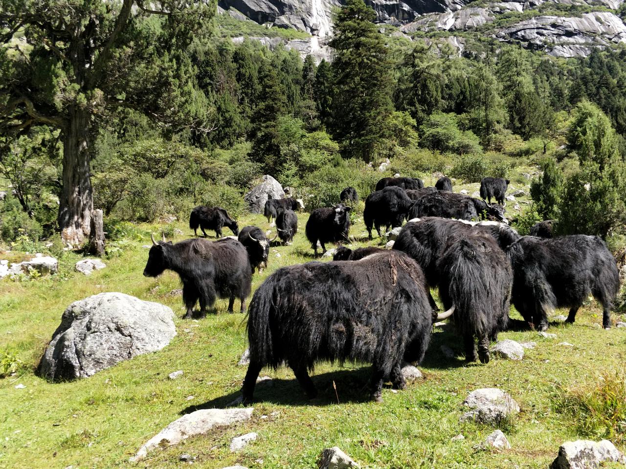 第1天 牦牛懒洋洋地吃着草,背后经流水侵蚀的山体十分耀眼。