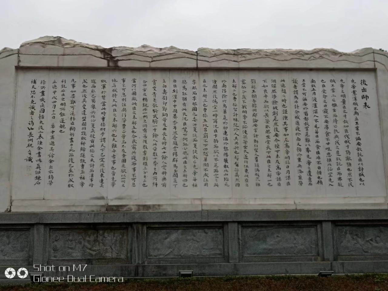 ![]() - 第1天 雕像背后是一块大理石板,石板两面分别篆刻着诸葛亮上书后主刘禅的《出师表》和《后出师表》,都是非常有名的文言古文,我们所熟知的“鞠躬尽瘁死而后已”正是出自于《后出师表》,这也是诸葛亮一生的真实写照。(ps:排队照相人太多,就使用金立M7的双倍变焦,避开排队人群,效果还是很可观的,隔一段距离变焦拍摄字体都能保证清晰)