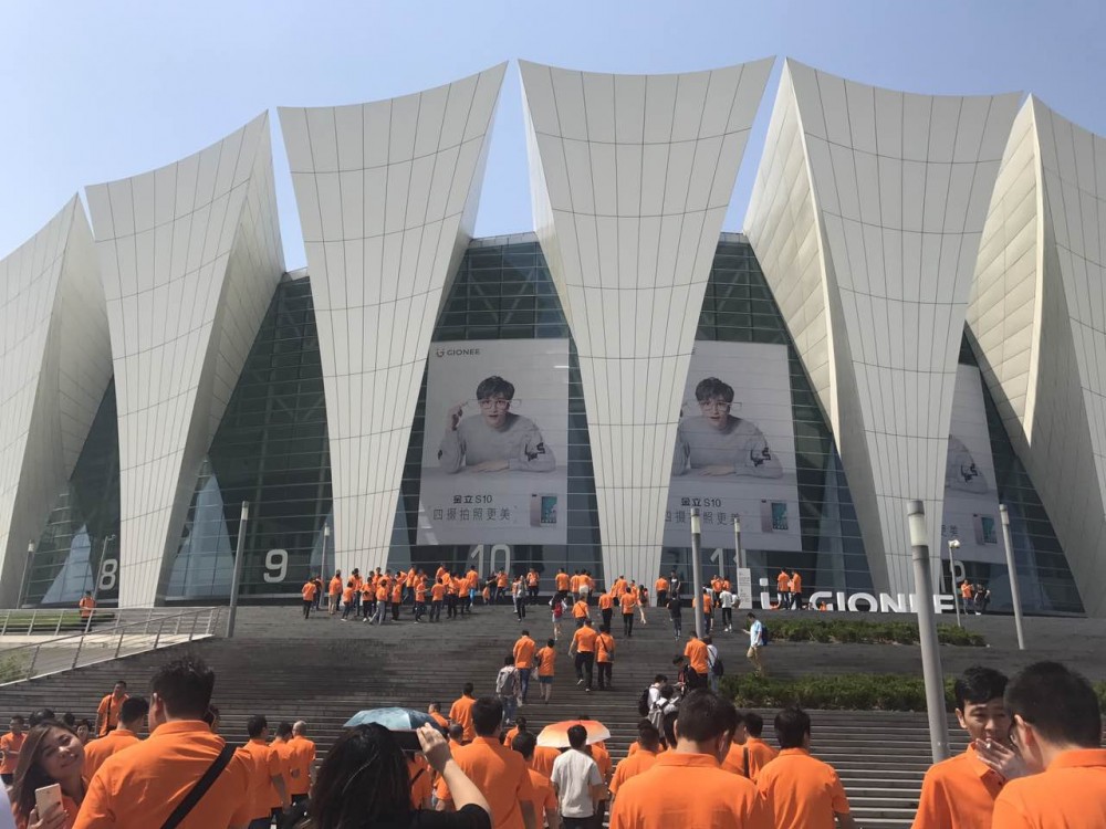 四摄才更美,金立S10上海发布会马上开始!美女小编已经到达体育中心,薛之谦的巨幅海报就挂在门口!